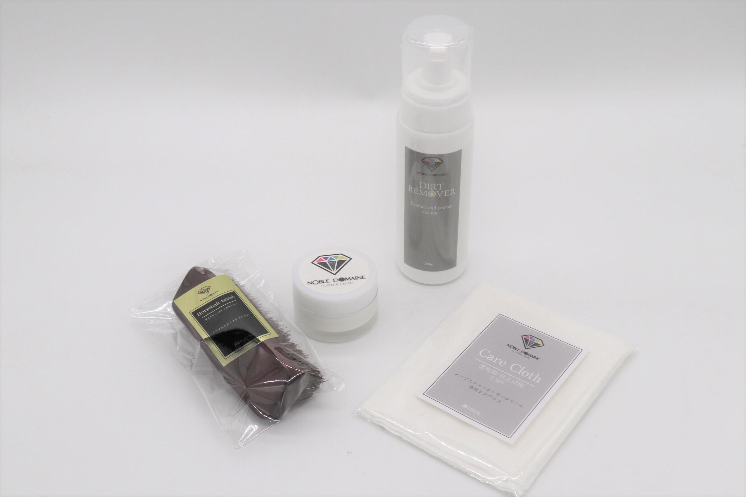 NOBLE DOMAINE(ノーブルドメーヌ)レザーケアクリーム/ケアクロス2枚/ダートリムーバー/馬毛ブラシ お手入れスタートフルセットです。